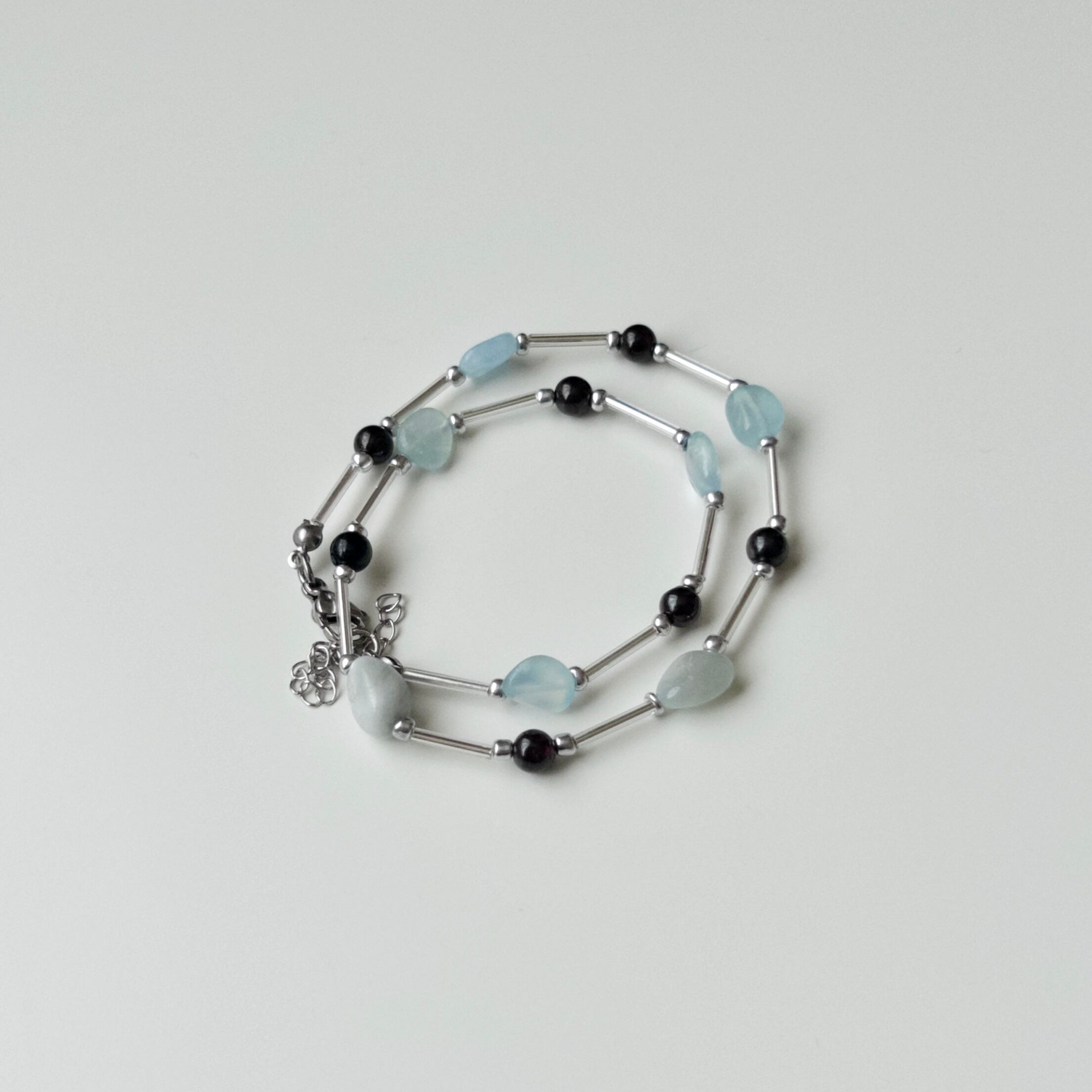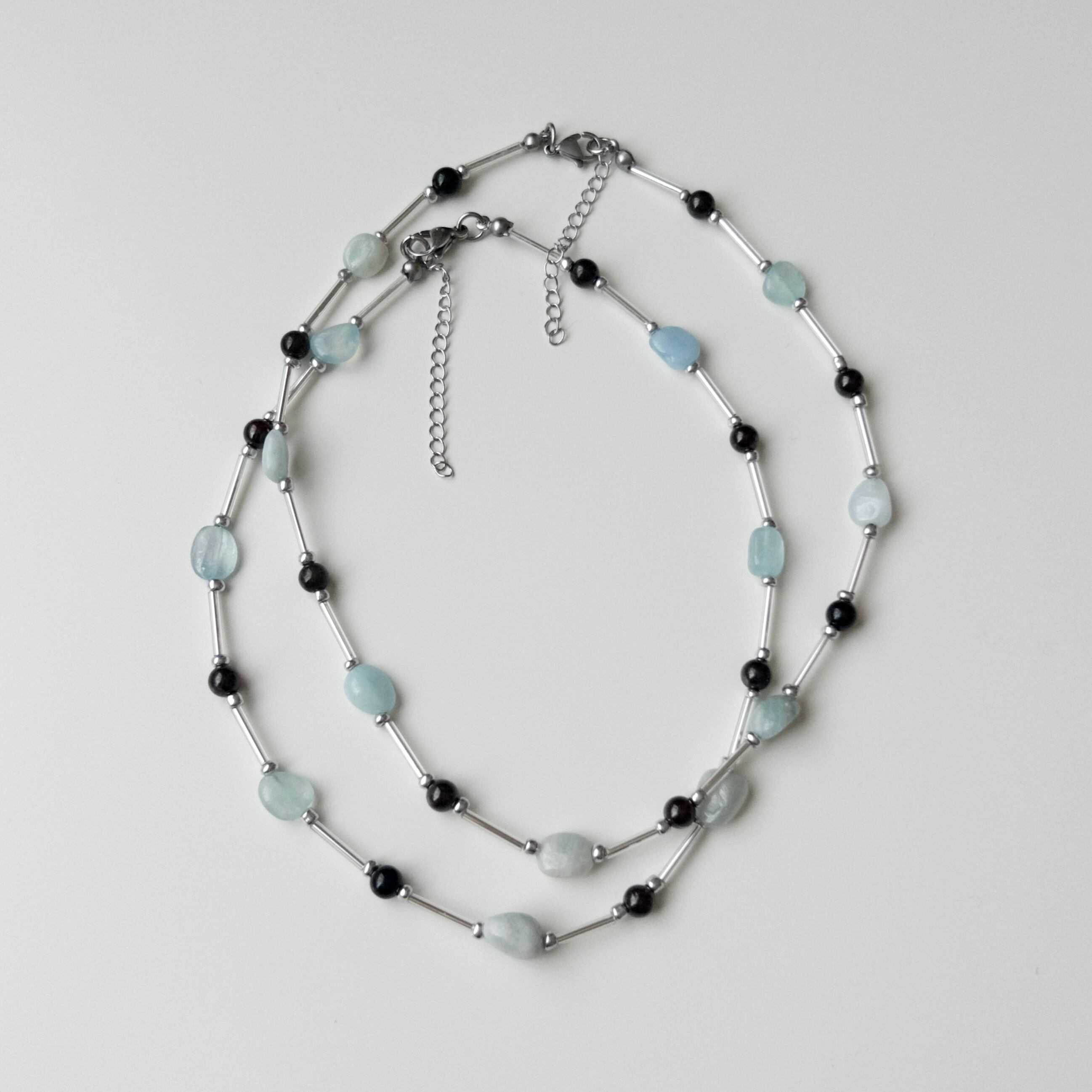 天然石アクアマリンとオブシディアンを使用しネックレスです。