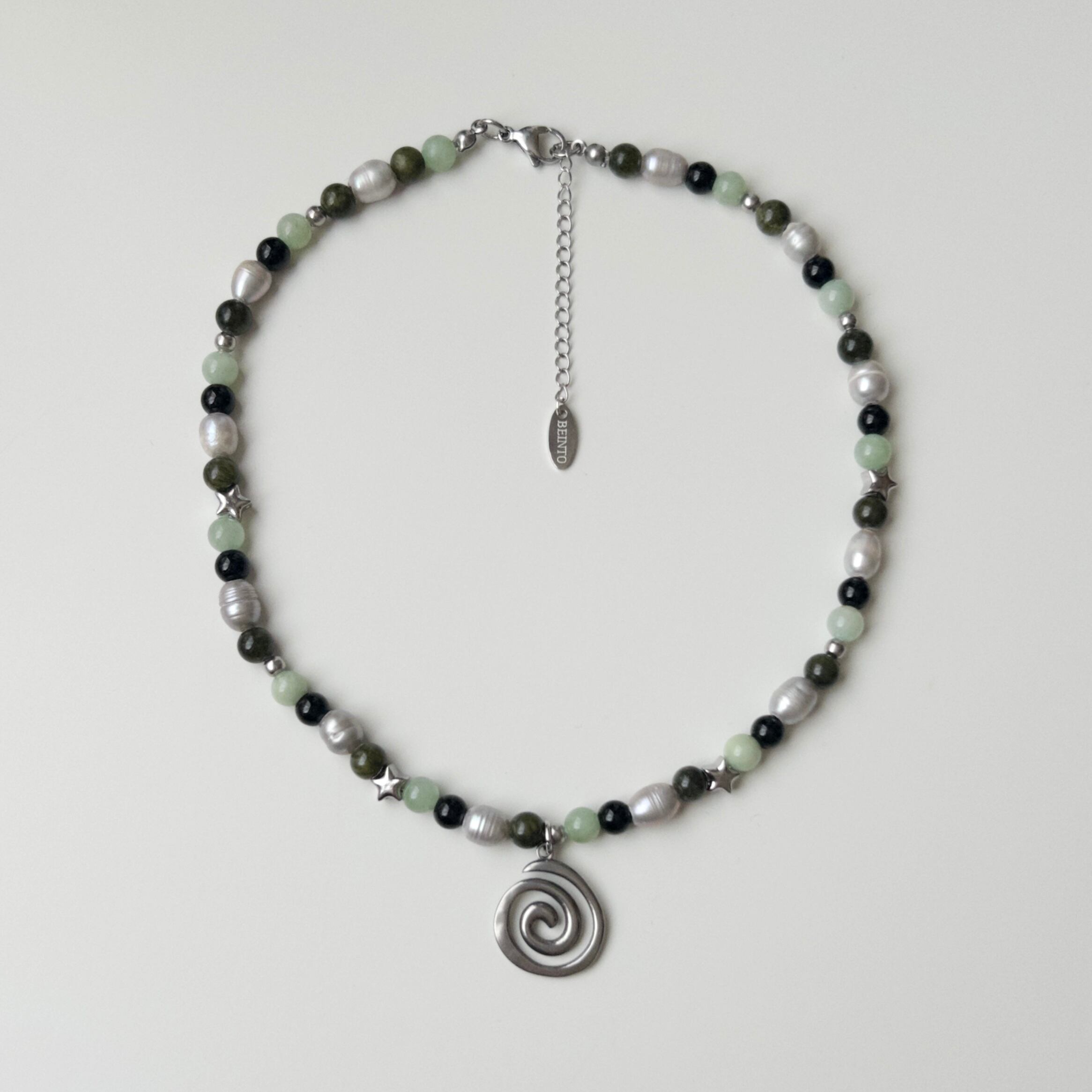 天然石イエロージェイドや淡水パールを使用したネックレスです。