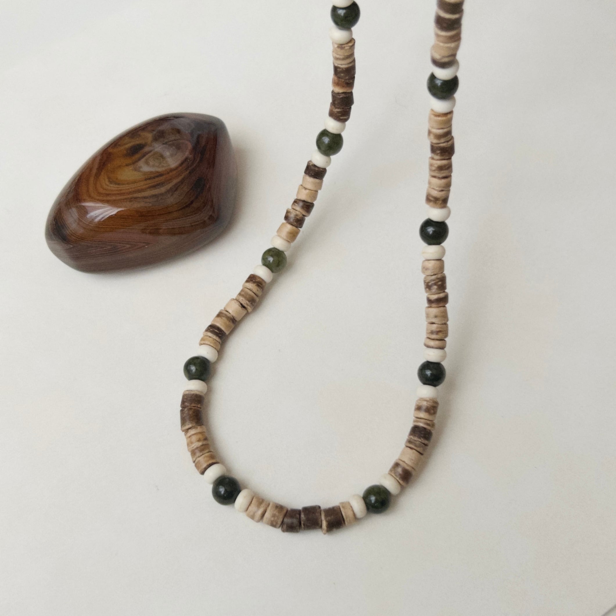ココナッツビーズに天然石イエロージェイドを使用したネックレスです。